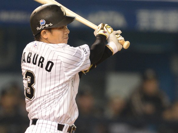 4番 サブロー 右中二 初球、外角高めのストレートをはじき返した打球は、右中間を深々と破り、ワンバウンドでフェンスに当たる。打ったサブローは悠々と2塁へ! |