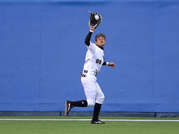 岡田は江川のフライをフェンス際まで後退し捕球!