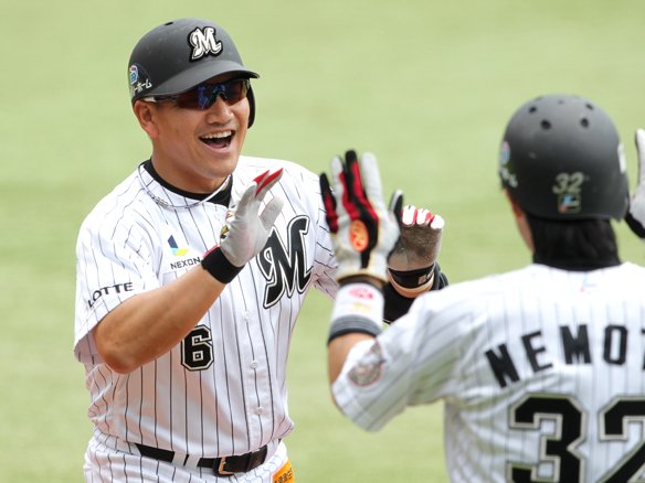 先制2ランを放った井口は満面の笑顔で根元とハイタッチ!
