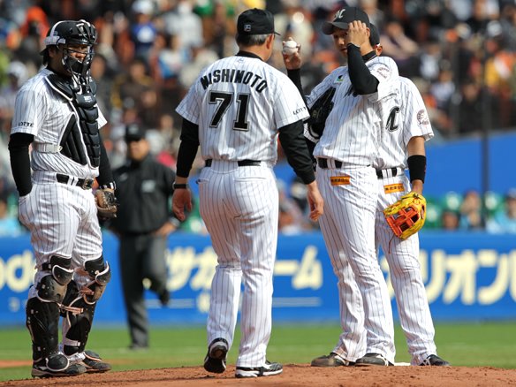 西本コーチがマウンドへ向かい唐川に助言を与える
