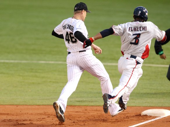 グライシンガーは福地のゴロを拾い上げそのまま1塁へ駆け込む!