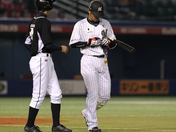 7番 里崎 二ゴ 2-2から外角高めのストレートを打ち返した強いゴロは、2塁ベースの方向に回り込んだセカンドに拾い上げられ、1塁へさばかれてしまった。 |