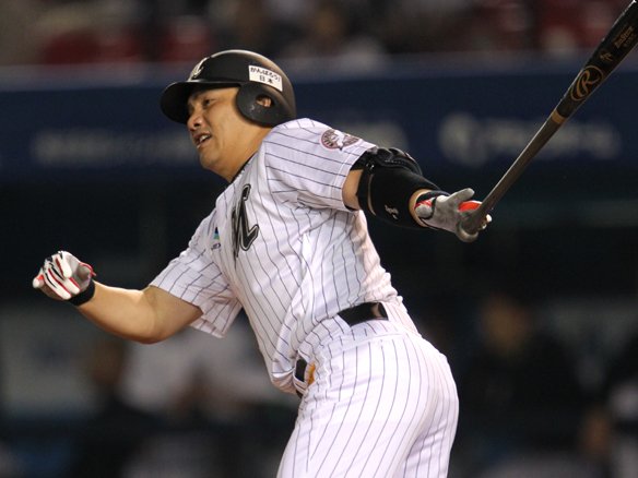 7番 里崎 中飛 初球、外角高めのストレートをはじき返した大きな打球は、風で右中間に流される。ウォーニングゾーンの手前まで追いかけるセンターに捕球されてしまった。 |