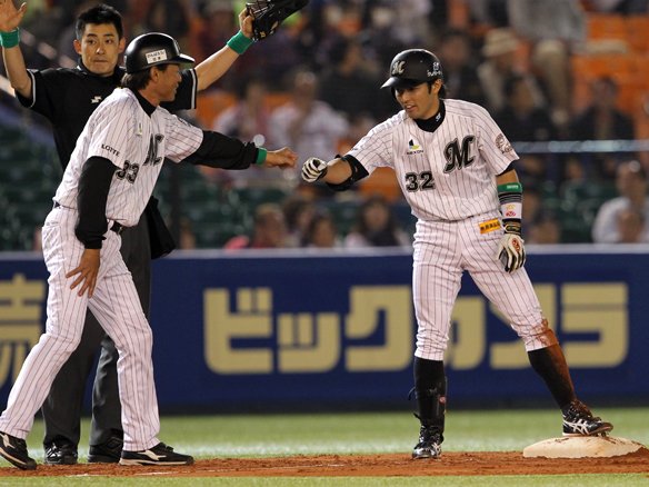 5番 角中 左中三 フルカウントから外角寄り低めのストレートをしっかりと引き付けて、左中間にはじき返した打球は、ワンバウンドでフェンスに到達! 2塁ランナーに続き、1塁ランナーも悠々と生還。3対0。3塁へ到達した角中は、佐藤3塁ベースコーチとグータッチ!! ![]() 3