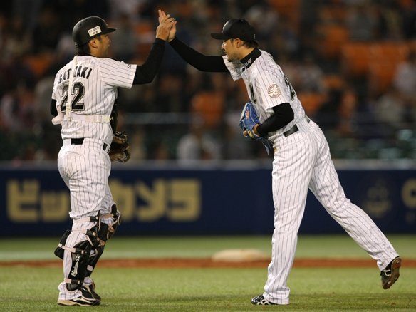 本拠地今季初登板となった内は最後を締め里崎とハイタッチ!