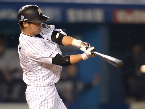 5番 角中 中安 1-2からの7球目、外角低めのストレートをジャストミートした鋭い打球は、センターの前に弾むクリーンヒット! |
