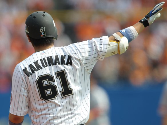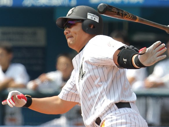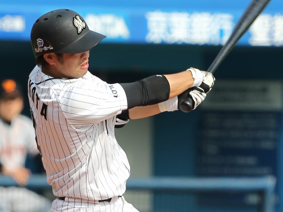 右へ左へ、打球を打ち分けての3安打を記録した角中。鮮やかなバットコントロールで、固め打ちを披露しました! |