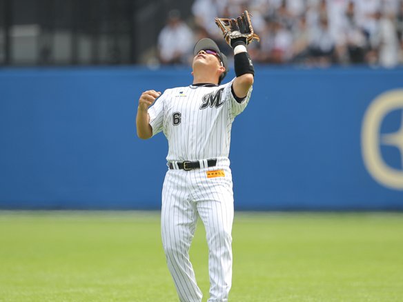 3番 井口 中飛 1-0から外角寄り低めのストレートを左中間の方向にはじき返したものの、半身の体勢でゆっくりと下がるセンターに捕球されてしまった。 |