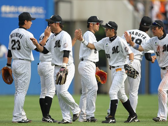 ピンチを切り抜け勝利の喜びを分かち合うマリーンズナイン!