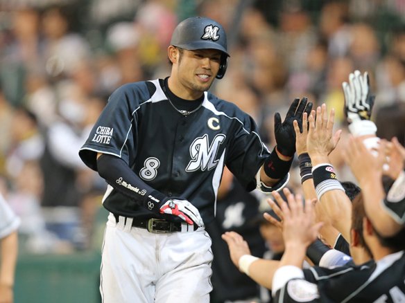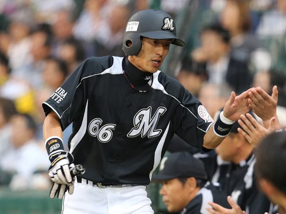 5番 角中 中安 2-1から高めのストレートをはじき返した打球は痛烈なライナーとなり、あっという間に二遊間を抜けていった! 角中はこれで9試合連続ヒット! |