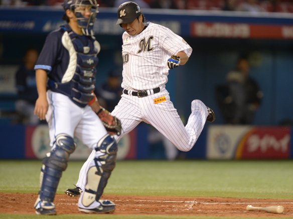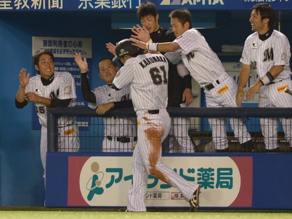 5番 角中 右中三 1-2から外角低めのカーブをはじき返し、痛烈な打球が右中間を真っ二つに破っていった! 打球処理の間に1塁ランナーが長駆ホームインし、2対2の同点! 打った角中は一気に3塁まで進んだ! また、角中はこれで28試合連続出塁!! ![]() 2