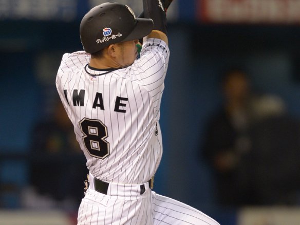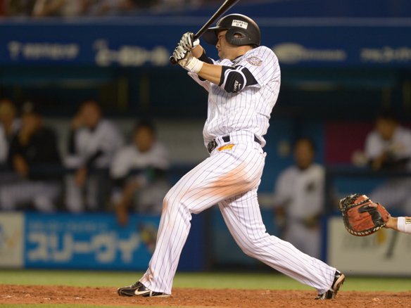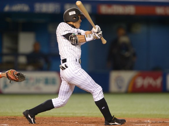 4番 サブロー 左安 0-2から外角のストレートをはじき返し、ライナーの打球がショートの頭上を越えるクリーンヒットとなった! |