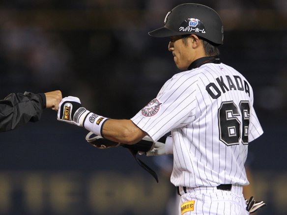 4番 サブロー 左越二 1-0から高めのストレートを捉えると、高く上がる打球がレフトの頭上を越え、ワンバウンドでフェンスまで転がる! 2塁ランナーが生還して3対1。打ったサブローは2塁へ到達した! サブローはこれで6試合連続ヒットを記録! ![]() 3
