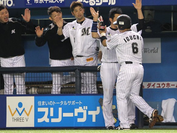 逆転打を放った井口を迎えてベンチのムードは最高潮!!