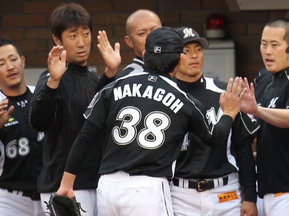 3者凡退に抑えた中郷をベンチ前でナインが出迎える