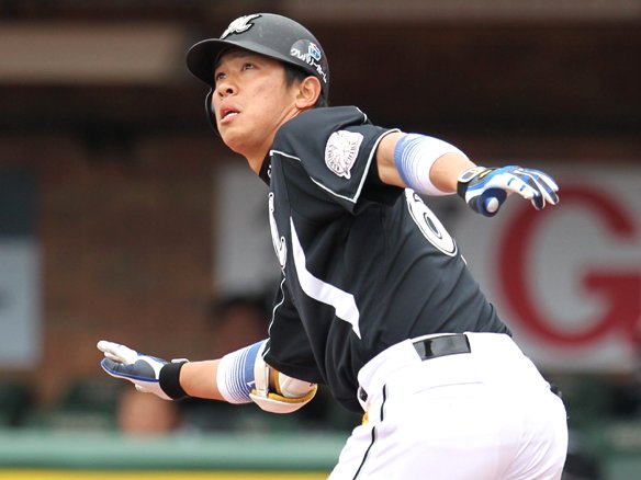5番 角中 左翼二 0-2から外角へのフォークボールを反対方向へ打ち返した打球は、高く上がってレフト線付近で弾んだ! 打球がフェンスまで到達したのを見た1塁ランナー・サブローは一気に生還! 1対0。打った角中は2塁へ進む! ![]() 0