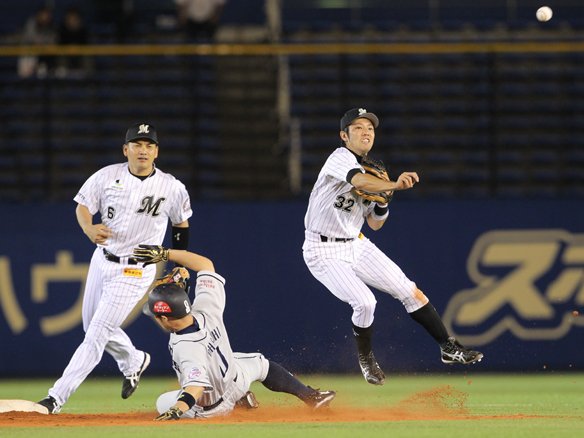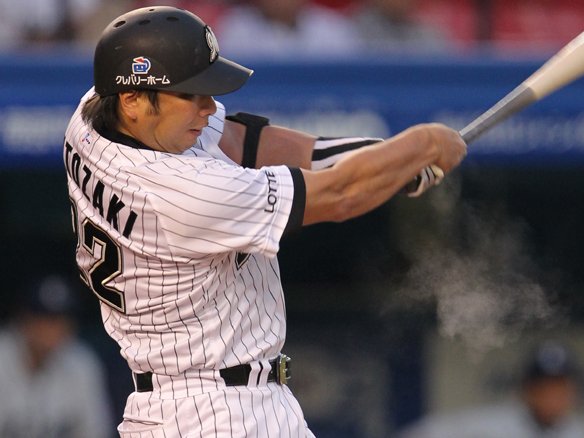無得点にこそ終わりましたが、里崎がフェンス直撃の2ベースヒットで出塁。6月17日のタイガース戦以来となる猛打賞を記録しました! |
