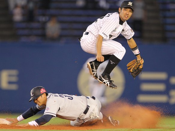 投手 唐川 2番 栗山 投安 3-1から高めのストレートをはじき返された打球は、ワンバウンドで捕球しようとしたピッチャーのグラブをはじく。転々とするボールはショートがカバーに入り1塁へ送るも、判定はセーフとなった。 |