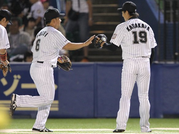唐川は星秀にこの試合初めてヒットを打たれましたが、片岡をダブルプレーに仕留め3人で料理! 好投を続けていきます! |