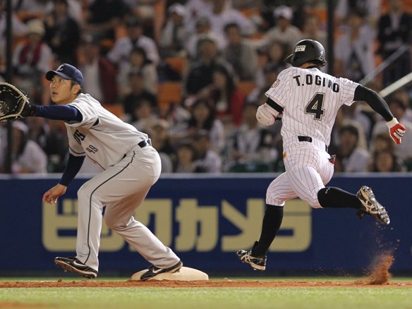 投手 野上 9番 荻野貴 遊安 初球、真ん中のスライダーを引っ張った打球は、三遊間の深い位置に転がる。ショートが捕球し1塁へ送球するが、荻野貴が持ち前の俊足で駆け抜けセーフとなった! |