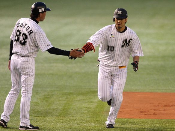 4番 サブロー 三ゴ 初球、高めのスライダーを引っ張り3塁線を襲うゴロとなる。しかし、サードに滑り込みながら逆シングルで拾われると、1塁へ送球された。 |