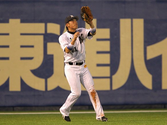 1番 聖澤 右飛 1-1から高めのストレートを振り抜かれるが、右中間への飛球はライトが捕球。2塁ランナーがタッチアップで3塁を狙うのを見たライトが素早く3塁へ返球するが、惜しくも間に合わず。 |