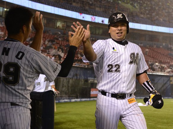 2つの四球でチャンスを作り、打席には8番・里崎。低めのボールをすくい上げた打球はそのままレフトスタンドに突き刺さる5号3ランホームランとなり、1点差まで詰め寄りました!! グラウンドには依然強い雨が降りしきっていますが、集中を切らすことなく逆転の機会をうかがっていきましょう! |