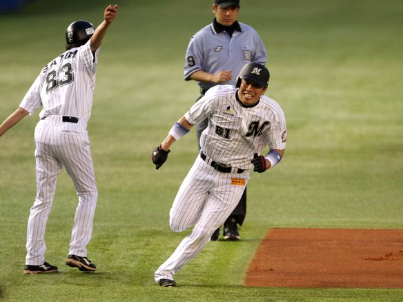 女房役・里崎が体を張ったプレーでチームを盛り立て、1番から始まる相手の攻撃を3人斬り。試合の主導権をガッチリと握っています! |