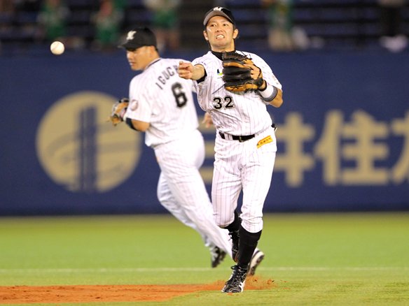 投手 成瀬 4番 多村 二ゴ 2-2から外角低めのチェンジアップをおっつけられた打球は一二塁間に飛んだが、セカンド・井口が反応良く横っ跳びして、グラブの先で捕まえる。素早く起き上がって、1塁に送るファインプレーを見せた! |