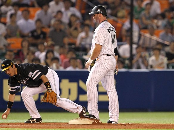 【千葉ロッテ選手交代】 1塁ランナー・サブロー→代走・岡田 |