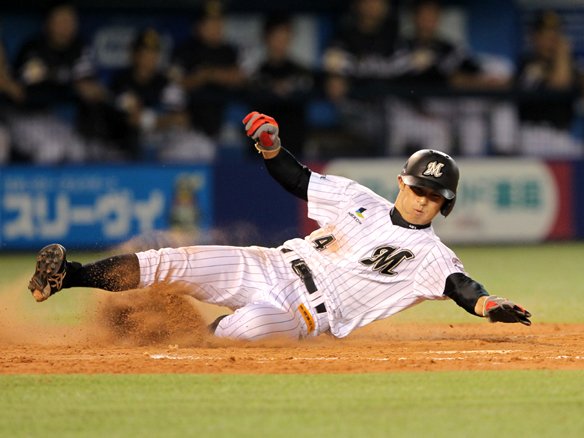 6番 井口 中安 初球、真ん中高めのストレートを見逃さずにピッチャー返ししたライナー性の打球は、ピッチャーの差し出したグラブの横を抜けて、センター前に転がる。バックホームされたが、2塁ランナー・角中が滑り込んで先制のホームイン! 1対0。 ![]() 1