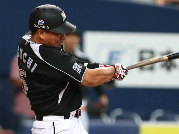 6番 サブロー フルカウントから内角高めに投じられたストレートにバットがピタリと止まった。 |