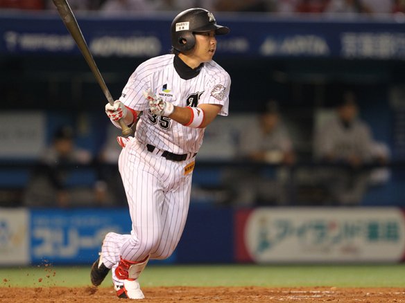 5番 角中 左安 フルカウントからの粘った後の8球目、高めに浮いたストレートを軽打し、三遊間への強いゴロが飛び込んだショートの先を抜けた! |