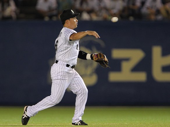 4番 李大浩 遊ゴ 2-2から外角高めのスライダーを引っ掛けさせ、弱いゴロを捕球したショートが丁寧に1塁へ送球した! |