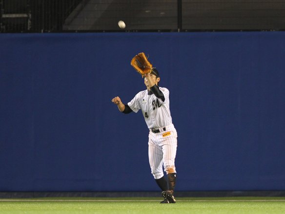 8番 今江 中飛 0-2から低めのストレートを打ち上げ、打球は右中間に上がる。ライト方向に流されていく飛球をセンターにつかまれた…。 |