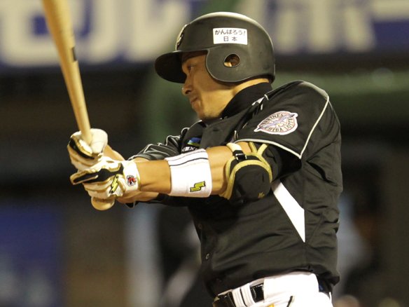 4番 サブロー 中越二 1-2からの5球目、低めへのスライダーを引っ張ると、打球が伸びてそのままフェンスを直撃! 打ったサブローは2塁へ! |