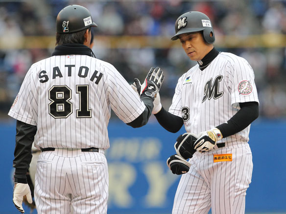 安打を放ち佐藤コーチとタッチを交わすサブロー!
