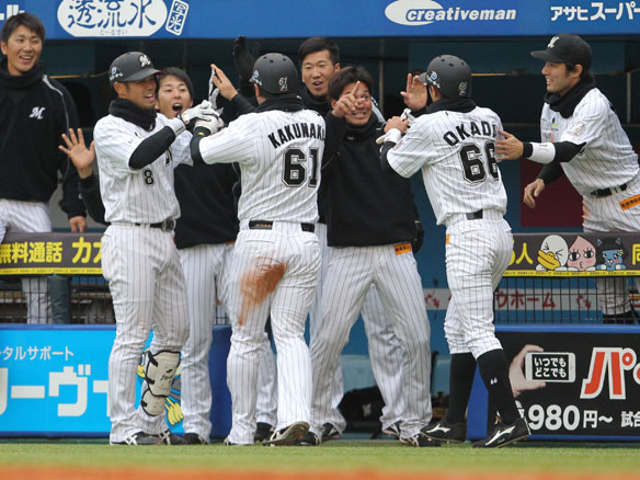激走を見せた岡田と角中をベンチが迎え入れる!