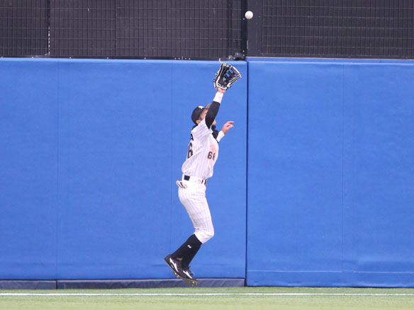 9番 岡田 三邪飛 ファウルフライをバルディリス(三)がつかんでバッターアウト 3アウトチェンジ |