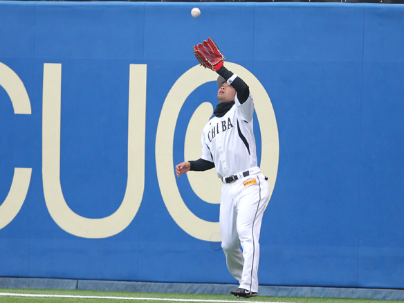 坂口の打球をフェンス際で捕球する清田