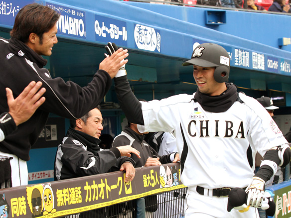 チーム今季初本塁打を放った清田は伊志嶺と力強くハイタッチ!