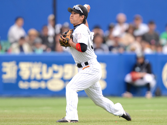 今宮の打球を処理した鈴木は本塁へ送球し得点を許さない!