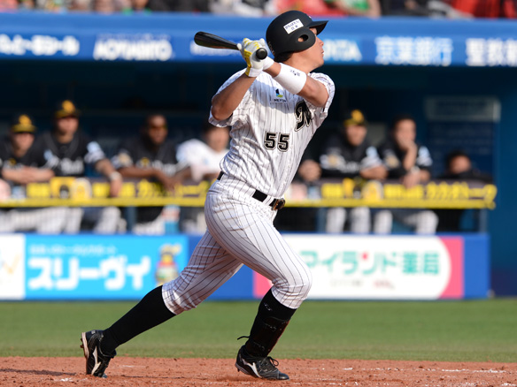 4番 サブロー 空三振 カウント2-2から低めのチェンジアップに空振り三振!決定機を逃す 3アウトチェンジ |