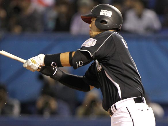 9番 福浦 右安 ライトへのヒットを放つ 1塁 |