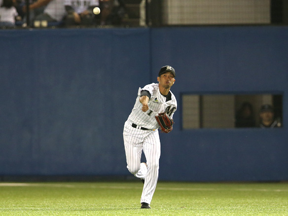 1番 西岡 左邪飛 ファウルフライを荻野貴(左)が捕球してバッターアウト 3アウトチェンジ |
