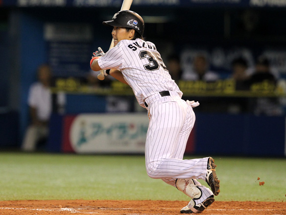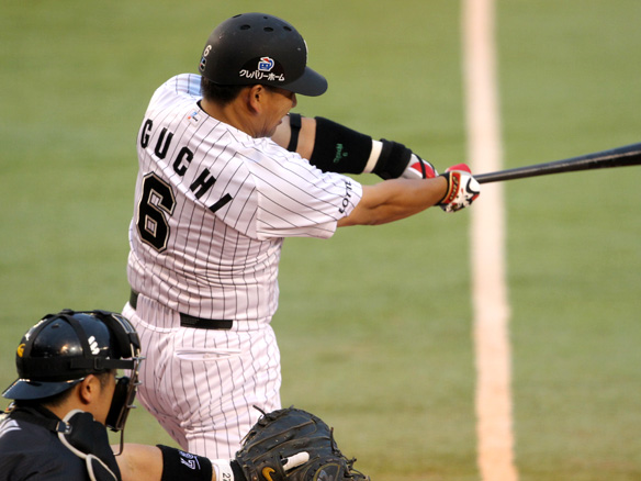 井口は遊撃手の頭上を越える左前安打を放つ!