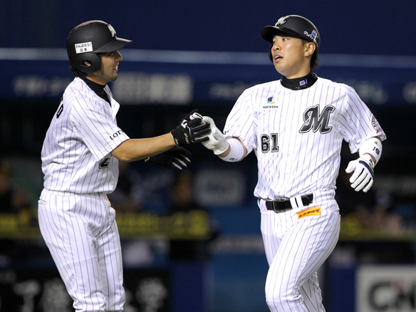 8番 里崎 左安 レフトへのヒット 1,2塁 |