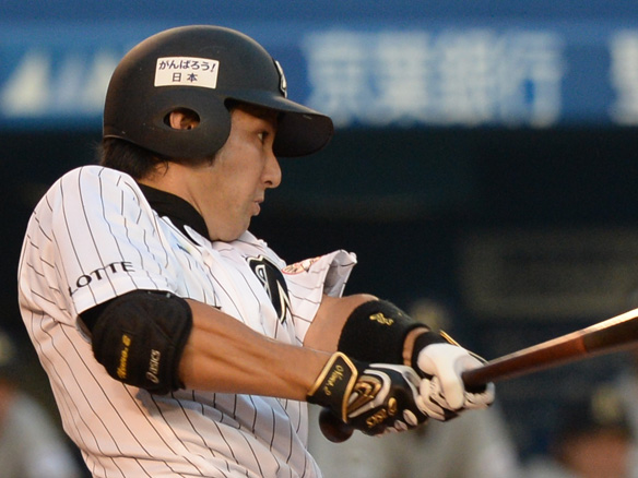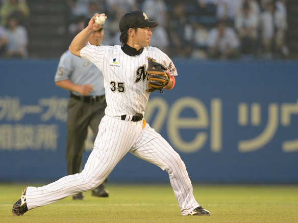 2番 角中 二安 鋭い打球がピッチャー金子千尋のグラブを襲い内野安打 1塁 |