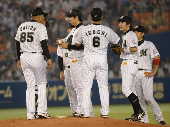 ピッチャー唐川に代わって松永がマウンドにあがる |