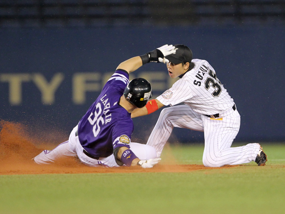 4番 今江 中安 1アウト2塁の1-1からタイムリーヒット ロ2-0ソ 1塁 ![]() 1